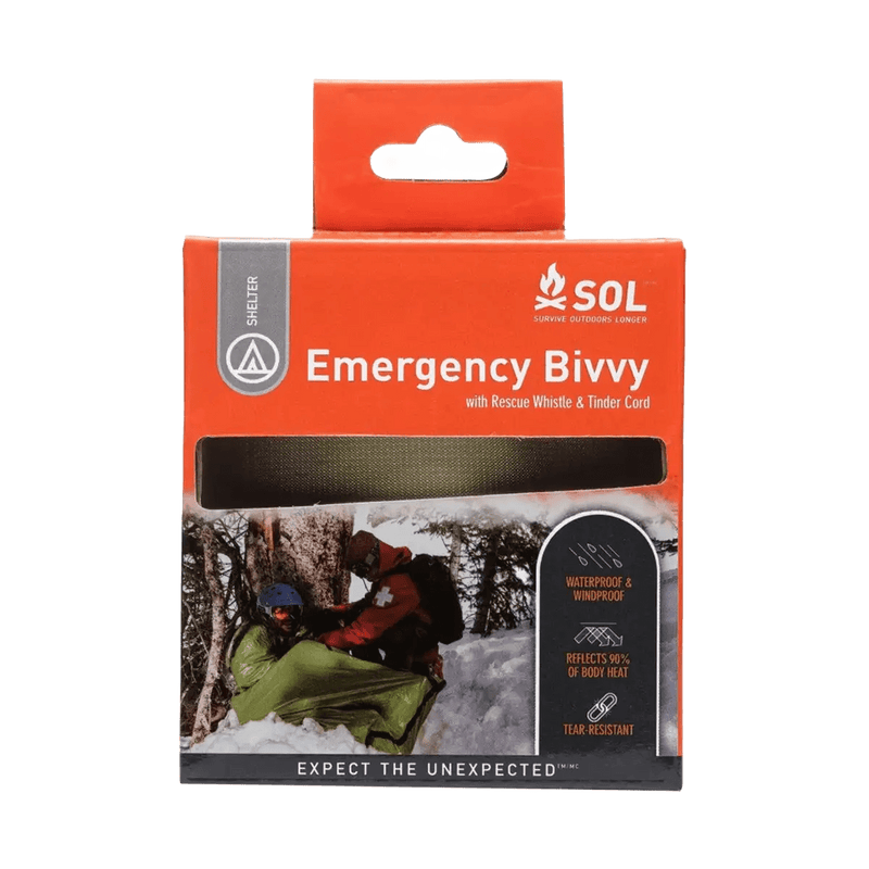 De SOL Emergency Bivvy is de bivakzak die u zoekt. Het is geheel waterbestendig en winddicht. Het speciaal geformuleerde materiaal reflecteert tot wel 90% van al uw lichaamswarmte, waardoor u in vele noodsituaties uw warmte kunt behouden. De bivak is te krijgen in signaal oranje voor wanneer u wilt opvallen en OD Groen voor wanneer het op gaan in de omgeving van belang is. De Bivakzak beschikt over een reddingsfluit, deze kun je gebruiken om uzelf hoorbaar te maken. De kern van het koord waarmee de draagzak sluit is gemaakt van waterbestendige katoenen tondel, dit vezelrijke materiaal is met een vlam of vonk eenvoudig te ontsteken. Een multi-functionele noodbivakzak dus.